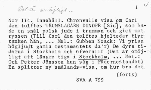 //// 1/ //// N:r 114, Innehåll. Chronvalls visa om Carl den tolftes TRUMSLAGARE DUNDFR [Si c} , som hade en snål polsk jude i trumman och' gick mot ryssen (Till Carl den tolftes hjeltedar flyr tanken hän, ... Mel,: Gubben Noack: Vi prisa högljudt gamla testamentets da'r) De dyra tiderna i Stockholm och öfverallt (Det är omöjligt att längre tiga i ^Stockholm, ... Mel.: Och Petter Jönsson han säg i Fäderneslandet) En splitter ny smålands-visa, om hur bra det //// (forts) //// SVA A 799 ////