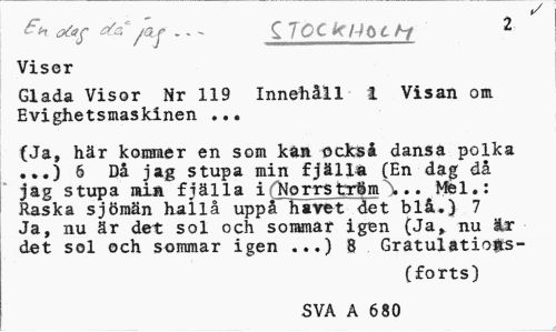 //// v //// - - - c iCCkUbthf 2 //// Viser //// Glada Visor Nr 119 Innehåll i Visan om Evighetsmaskinen ... //// (Ja, här kommer en som ka» också dansa polka ...) 6 Då jag stupa min fjälla (En dag då jag stupa min fjälla i fNorrs trftm\ .. Mel.: Raska sjömän hallå uppå havet det blå.) 7 Ja, nu är det sol och sommar igen (Ja> nu är det sol och sommar igen ...) 8 Gratulatiogcs- //// (forts) //// SVA A 680 ////