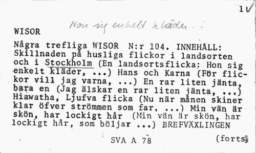 //// 11/ //// höhA SWJ UJUJ k, - ^ //// WISOR //// Några trefliga WISOR N:r 104. INNEHÅLL: Skillnaden pa husliga flickor i landsorten och i Stockholm (En landsortsflicka: Hon sig enkelt kläder, ...) Hans och Karna (För flickor vill jag varna, .,.) En rar liten jänta, bara en (Jag älskar en rar liten jänta, ..,) Hiawatha, Ljufva flicka (Nu när månen skiner klar öfver strömmen som far, ...) Min vän är skön, har lockigt hår (Min vän är skön, har lockigt hår, som böljar ...) BREFVÄXLINGEN //// 5 SVA A 78 (£orta| ////