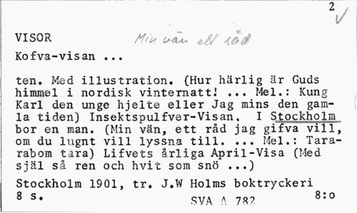 //// VISOR u^U, ^ //// Kofva-visan ... //// ten. Med illustration. (Hur härlig är Guds himmel i nordisk vinternatt] ... Mel.: Kung Karl den unge hjelte eller Jag mins den gamla tiden) Insektspulfver-Visan. I Stockholm bor en man. (Min vän, ett råd jag gifva vill, om du lugnt vill lyssna till. ... Mel.: Tara-rabom tara) Lifvets årliga April-Visa (Med själ så ren och hvit som snö ...) //// Stockholm 1901, tr. J.W Holms boktryckeri 8 s. SVA \ 78? 8:0 ////