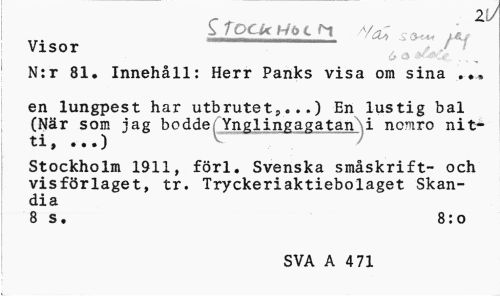 //// Visor //// N:r 81. Innehåll: Herr Panks visa om sina ... //// en lungpest har utbrutet,...) En lustig bal (När som jag bodde;Ynglingagatan' i nomro nit- //// Stockholm 1911, förl. Svenska småskrift- och visförlaget, tr. Tryckeriaktiebolaget Skandia //// 8 s. 8:o //// SVA A 4 4 ////