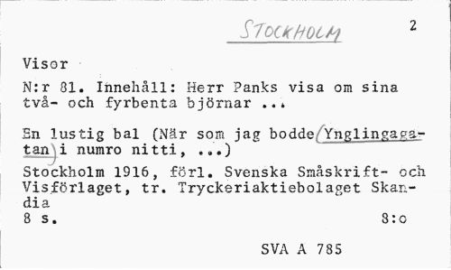 //// S7oti(HQLH 2 //// Visor //// N:r 01. Innehåll: Herr Panks visa om sina två- och fyrbenta björnar ..» //// Sn lustig bal (När som jag bodde Ynglingagatan j i numro nitti, ...) //// Stockholm 1916, förl. Svenska Småskrift- och Visförlaget, tr. Tryckeriaktiebolaget Skandia //// 8 s. 3:c //// SVA A 785 ////