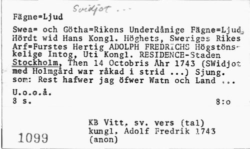 //// . - - //// Fägne=Ljud //// Swea= och Götha=Rikens Underdånige Fägne-Ljud^. Hördt wid Hans Kongl. Höghets, Sweriges Rikes Arf=Furstes Hertig ADOLPH FREDRICHS Högstöns-kelige Intog, Uti Kongl. RESIDENCE-Staden Stockholm. Then 14 Octobris Ahr 1743 (SWidjot med Holmgård war råkad i strid ...) Sjung, som: Rest hafwer jag öfwer Watn och Land //// U.o.o.å. //// 8 s. 8:o //// KB Vitt, sv. vers (tal) kungl. Adolf Fredrik 1743 //// 1099 (anon) ////
