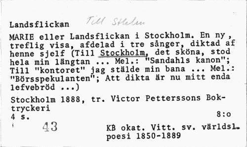 //// Landsflickan //// MARIE eller Landsflickan i Stockholm. En ny , treflig visa, afdelad i tre sånger, diktad af henne sjelf (Till Stockholm, det sköna, stod hela min längtan ... Mel.: "Sandahls kanon"; Till "kontoret" jag stälde min bana ... Mel.: "Börsspekulanten"; Att dikta är nu mitt enda lefvebröd ...) //// Stockholm 1888, tr. Victor Petterssons Boktryckeri //// 4 s. 8:0 //// * 43 KB okat. Vitt. sv. världsl. //// poesi 1850-1889 ////