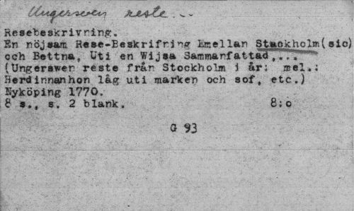 //// AJM-ZjL. . - //// Resebeskrivring. //// En nö jsam Reae-Beskrif ni >-sr Emellan St»ekholm( eio) cch Bettna, Uti en Wljaa Sammanfattad , .TT**** (Ungersven reste från Stockholm i år; usel.; Berdinnanhon låg uti marken och sof, etc.) Kyköping 1770. //// 8 s., s. 2 blank. 8;o //// G 93 ////