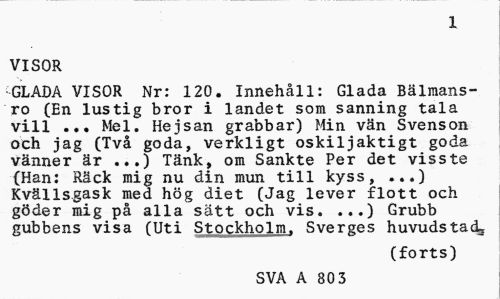 //// 1 //// VISOR //// GLADA VISOR Nr: 120. Innehåll: Glada Bälmans-ro (En lustig bror i landet som sanning tala vill ... Mel. Hejsan grabbar) Min vän Svenson och jag (Två goda, verkligt oskiljaktigt goda vänner är ...) Tänk, om Sankte Per det visste (Han: Räck mig nu din mun till kyss, ...) Kvällsgask med hög diet (Jag lever flott och göder mig på alla sätt och vis. ...) Grubb gubbens visa (Uti Stockholm. Sverges huvudstads //// (forts) //// SVA A 86 1 ////