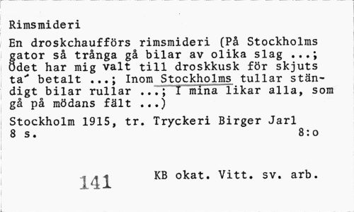 //// Rimsmideri //// En droskchaufförs rimsmideri (På Stockholms gator så trånga gå bilar av olika slag ...; ödet har mig valt till droskkusk för skjuts ta"* betalt ...; Inom Stockholms tullar ständigt bilar rullar I mina likar alla, som gå på mödans fält ...) //// Stockholm 1915, tr. Tryckeri Birger Jarl 8 s. 8:0 //// 141 KB okat. Vitt. sv. arb. ////