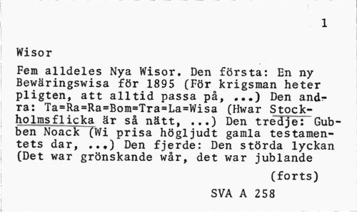 //// 1 //// Wisor //// Fem alldeles Nya Wisor. Den första: En ny Bewäringswisa för 1895 (För krigsman heter pligten, att alltid passa på, ...) Den andr ra: Ta=Ra=Ra=Bom=Tra=La=Wisa (Hwar Stockholmsflicka är så nätt, ...) Den tredje: Gub-ben Noack (Wi prisa högljudt gamla testamentets dar, ...) Den fjerde: Den störda lyckan (Det war grönskande wår, det war jublande //// (forts) //// SVA A 258 ////