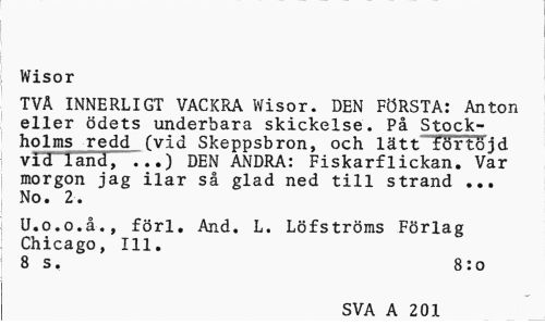 //// Wisor //// TVÄ INNERLIGT VACKRA Wisor. DEN FÖRSTA: Anton eller ödets underbara skickelse. På Stockholms redd (vid Skeppsbron, och lätt förtöjd vid land, ...) DEN ANDRA: Fiskarflickan. Var morgon jag ilar så glad ned till strand ... No. 2. //// U.o.o.å., förl. And. L. Löfströms Förlag Chicago, 111. //// 8 s. 8:0 //// SVA A 201 ////