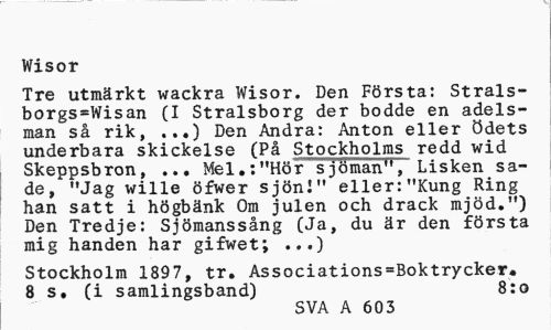 //// Wisor //// Tre utmärkt wackra Wisor. Den Första: Strals-borgs=Wisan (I Stralsborg der bodde en adelsman så rik, ...) Den Andra: Anton eller ödets underbara skickelse (På Stockholms redd wid Skeppsbron, ... Mel.:"Hör sjöman", Lisken sade, "Jag wille öfwer sjön!" eller:"Kung Ring han satt i högbänk Om julen och drack mjöd.") Den Tredje: Sjömanssång (Ja, du är den första mig handen har gifwet; ...) //// Stockholm 1897, tr. Associations=Boktrycker. 8 s, (i samlingsband) 8:0 //// SVA A 603 ////
