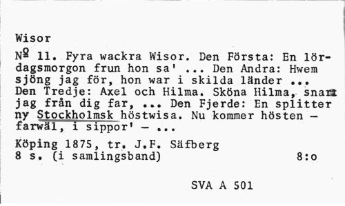 //// Wisor //// N8 11. Fyra wackra Wisor. Den Första: En lördagsmorgon frun hon sa' ... Den Andra: Hwem sjöng jag för, hon war i skilda länder ... Den Tredje: Axel och Hilma. Sköna Hilma, snaxt jag från dig far, ... Den Fjerde: En splitter ny Stockholmsk höstwisa. Nu kommer hösten -farwäl, i sippor1 - ... //// Köping 1875, tr. J.F. Säfberg 8 s. (i samlingsband) 8:o //// SVA A 325 ////