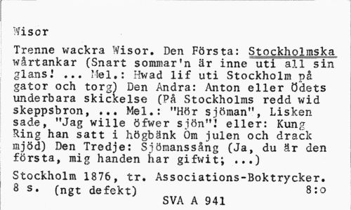 //// Wisor //// Trenne wackra Wisor. Den Första: Stockholmska wårtankar (Snart sommar'n är inne uti all sin glans.' ... Mel.: Hwad lif uti Stockholm på gator och torg) Den Andra: Anton eller ödets underbara skickelse (På Stockholms redd wid skeppsbron, ... Mel.: "Hör sjöman", Lisken sade, "Jag wille öfwer sjön"! eller: Kung Ring han satt i högbänk Öm julen och drack mjöd) Den Tredje: Si ömanssång (Ja, du är den första, mig handen har gifwit; ...) //// Stockholm 1876, tr. Associations-Boktrycker. 3 s. (ngt defekt) 8:0 //// SVA A 941 ////
