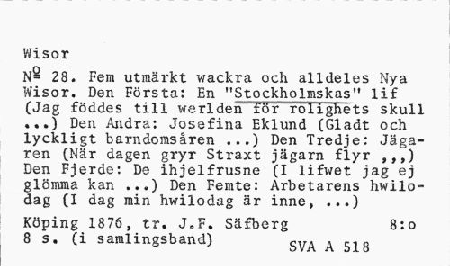 //// Wisor //// N- 28. Fem utmärkt wackra och alldeles Nya Wisor. Den Första: En "Stockholmskas" lif (Jag föddes till werlden för rolighets skull ...) Den Andra: Josefina Eklund (Gladt och lyckligt barndomsåren ...) Den Tredje: Jägaren (När dagen gryr Straxt jägarn flyr ,,,) Den Fjerde: De ihjelfrusne (I lifwet jag ej glömma kan ...) Den Femte: Arbetarens hwilodag (I dag min hwilodag är inne, ...) //// Köping 1876, tr. J.F. Säfberg 8:0 //// 8 s. (i samlingsband) SVA a 518 ////
