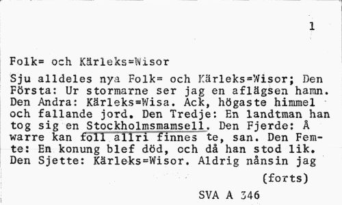//// 346 //// Folk= och Kärleks-Wisor //// Sju alldeles nya Folk= och Kärleks-Wisor; Den Första: Ur stormarne ser jag en aflägsen hamn. Den Andra: Kärleks=Wisa. Ack, högaste himmel och fallande jord. Den Tredje: En landtman han tog sig en Stockholmsmamsell. Den Fjerde: Å warre kan foll allri finnes te, san. Den Femte: En konung blef död, och då han stod lik. Den Sjette: Kärleks=Wisor. Aldrig nånsin jag //// (forts) //// SVA A 218 ////