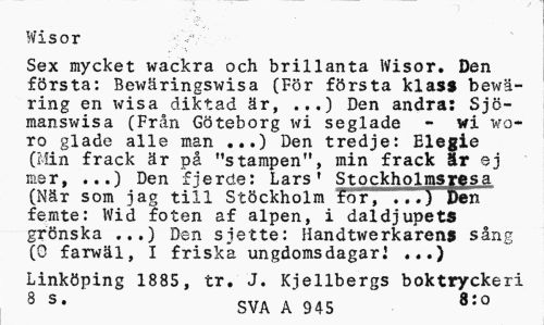 //// Wisor //// Sex mycket wackra och brillanta Wisor. Den första: Bewäringswisa (För första klass bewä-ring en wisa diktad är, ..,) Den andra: Sjö-manswisa (Från Göteborg wi seglade - wi voro glade alle man Den tredje: Elegie (Min frack är på "stampen", min frack är ej mer, ...) Den fjerde: Lars' Stockholmsresa (När som jag till Stockholm for, 777} Den femte: Wid foten af alpen, i daldjupets grönska ...) Den sjette: Handtwerkarens sång (0 farwäl, I friska ungdoms dagar! //// Linköping 1885, tr. J. Kjellbergs boktryckeri //// 8 S' SVA A 945 8:0 ////