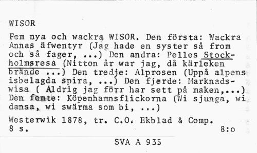 //// WISOR //// Fsm nya och wackra WISOR. Den första: Wackra Annas äfwentyr (Jag hade en syster så from och så fager, ...) Den andra: Pelles Stockholms re sä (Nitton år war jag, då kärleken brände TTT) Den tredje: Alprosen (Uppå alpens isbelagda spira, ...) Den fjerde: Marknads-wisa ( Aldrig jag förr har sett på maken,...) Den femte: Köpenhamns flickorna (Wi sjunga, wi dansa, wi swärma som bi, ...) //// Westerwik 1878, tr. C.O. Ekblad & Comp. 8 s. 8:0 //// SVA A 9 35 ////