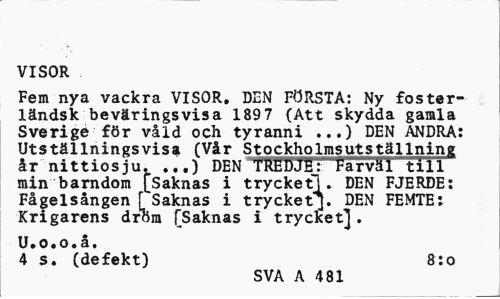 //// VISOR //// Fem nya vackra VISOR. DEN FÖRSTA: Ny fosterländsk beväringsvis a 189 7 (Att skydda gamla Sverige för våld och tyranni DEN ANDRA: //// Utställningsvisa (Vår Stockholmsutställning år nittiosju. ...) DEN "TREDJE: Farväl till min barndom [Saknas i trycket!. DEN FJERDE: Fågelsången [ Saknas i trycket]. DEN FEMTE: Krigarens dröm [Saknas i trycket] . //// U.o.o.å, //// 4 s. (defekt) 8:0 //// SVA A 481 ////