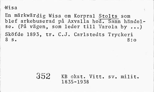 //// -Wisa //// En märkwärdig Wisa om Korpral Stolts som blef arkebuserad på Axvalla hedT Sann händelse. (På vägen, som leder till Varola by ,..) //// Sköfde 1893, tr. C.J. Carlstedts Tryckeri 8 s. 8:0 //// 352 KB okat. Vitt. sv. milit. //// 1835-1938 ////