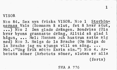 //// 1 //// VISOR //// N:o 84. Sex nya friska VISOR. N:o 1 Storbön-nernas Vals (Sommarn ä slut, fet ä hvar stut, .7.) N:o 2 Den glade drängen. Bondvisa (Ola hvar byens grannaste dräng, Alltid så glad i hågen, ... Mel i Mannen och hustrun satte sig ned) N:o 3. Helga de la Brache (Om Helga de la Brache jag nu sjunga vill en sång. ... Mel.:"Ung Erik mötte Karin sin.") N:o 4. Arbetets söner (Arbetets söner, sluten er alla //// (forts) //// SVA A 7 76 ////