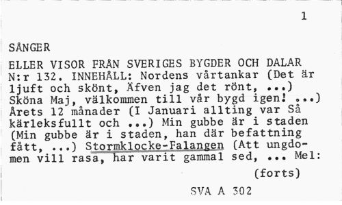 //// 1 //// SÅNGER //// ELLER VISOR FRÅN SVERIGES BYGDER OCH DALAR N:r 132. INNEHÅLL: Nordens vårtankar (Det är ljuft och skönt, Äfven jag det rönt, ...) Sköna Maj, välkommen till vår bygd igen.' ...) Årets 12 månader (I Januari allting var Så kärleksfullt och ...) Min gubbe är i staden (Min gubbe är i staden, han där befattning fått, ...) Stormklocke-Falangen (Att ungdomen vill rasa, har varit gammal sed, ... Mel: //// (forts) //// SVA A 302 ////