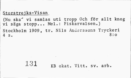 //// Storstreiks-Visan //// (Nu ska" vi samlas uti tropp Och för allt knog vi säga stopp... Mel.: Fiskarvalsen.) //// Stockholm 1909, tr. Nils Anderssons Tryckeri 4 s. 8:0 //// J- ^ KB okat. Vitt. sv. arb. ////