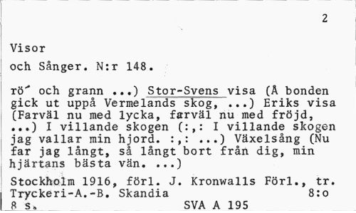 //// 2 //// Visor //// och Sånger. N:r 148. //// rö"* och grann ...) Stor-Svens visa (Å bonden gick ut uppå Vermelands skog, ...) Eriks visa (Farväl nu med lycka, farväl nu med fröjd, ...) I villande skogen (:,: I villande skogen jag vallar min hjord. :,: ...) Växelsång (Nu far jag långt, så långt bort från dig, min hjärtans bästa vän. ...) //// Stockholm 1916, förl. J. Kronwalls Förl., tr. //// Tryckeri-A.-B. Skandia 8:o //// 8 S» SVA A 195 ////