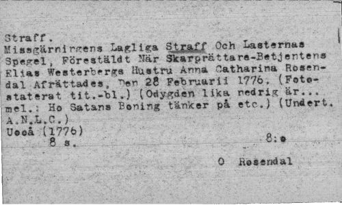//// Straff . //// Missgärningens Lagliga Stjyaff Och Lasternas Speprel, Förestäldt När Skarprättare-Betjentens Elias Westerbergs Hustru Anna Catharina Rosendal Af rättades, ^en 28 Februari! 1776, (Foto-staterat t it.-bl.) (Odygden lika nedrig är... mel.; Ho Satans Boning tänker på etc.) (Undert. A.N.L.C.) Uooå (1776) //// 8 s. 8; a //// 0 Rosendal ////
