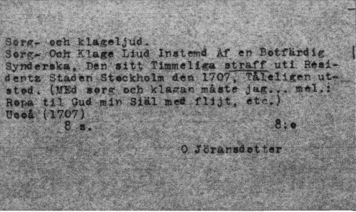 //// 7 v'-''. ,'¦':. • - ¦ * > - " ^ SI* //// Sorg- och klagoljud. //// Sorg- Och Klage Liud Inatemd Af tn Botfärdig Synd er »ka, Denaitt Tlajmeliga straff uti Seai-dentÄ Staden Stockholm den 1707", TåXeligen ut-, stod, UfBd aorg ocb klagan måste jag..., mel. i • Ropa til gud min Sial med flijt, etc,) Ueoå (1707) //// 8 s. 8.o //// > l »%< « « " • i % - \ * % I " . Yr*' //// 0 Jörärsdetter //// • ' . //// . . »IPf '" - //// : - - ; • • • ... . - • mmm ////