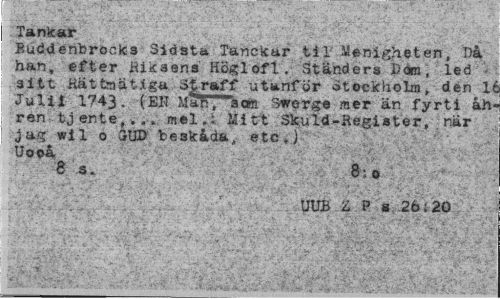 //// Tankar //// Buddenbrocks Sidsta Tanckar ti 1 Menigheten, Då han, efter j&i&aanä KÖglofl. Ständers Dom, led sitt Hattmät.lga Straff utanför Stockholm, den li Ju Ht 1743. (EK Man,'"'a cm Swerge mer än fyrti ål* ren tjente,.,» mel.; Mitt Skuld-Kegister, . när jag wi 1 o 3UD beskåda, etc.) Uooå //// 8 a. 8:o //// UUB Z P 8 26;20 //// ¦';'*' - . ¦ - ' '¦) v - *. ' • ...:¦> , v ' ,7 • .-'-v ' ,>f v. ////