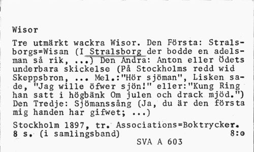//// Wisor //// Tre utmärkt wackra Wisor. Den Första: Strals-borgs=Wisan (I Stralsborg der bodde en adelsman så rik, ...) Den Andra: Anton eller ödets underbara skickelse (På Stockholms redd wid Skeppsbron, ... Mel.:"Hör sjöman'1, Lisken sade, "Jag wille öfwer sjön!" eller:"Kung Ring han satt i högbänk Om julen och drack mjöd.") Den Tredje: Sjömanssång (Ja, du är den första mig handen har gifwet; ...) //// Stockholm 1897, tr. Associations=Boktrycker, 8 s. (i samlingsband) 8:0 //// SVA A 603 ////