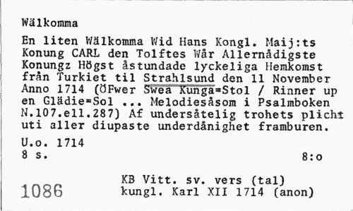 //// Wälkomma //// En liten Wälkomma Wid Hans Kongl. Maijrts Konung CARL den Tolftes Wår Allernådigste Konungz Högst åstundade lyckeliga Hemkomst från Turkiet til Strahlsund den 11 November Anno 1714 (ÖFwer Swea Kunga=Stol / Rinner up en Glädie=Sol ... Melodiesåsom i Psalmboken N.107.ell.287) Af undersåtelig trohets plicht uti aller diupaste underdånighet framburen. //// U.o. 1714 //// 8 s. 8:o //// KB Vitt. sv. vers (tal) //// 1086 kungl. Karl XIX 1714 (anon) ////