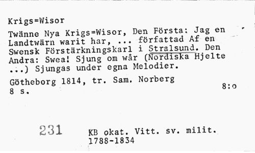 //// Krigs=Wisor //// Twänne Nya Krigs=Wisor, Den Första: Jag en Landtwärn warit har, ... författad Af en Swensk Förstärkningskarl i Stralsund. Den Andra: Swea! Sjung om wår (Nordiska Hjelte ...) Sjungas under egna Melodier. //// Götheborg 1814, tr. Sam. Norberg 8 s. 8:0 //// 231 KB okat. Vitt. sv. milit. //// 1788-1834 ////