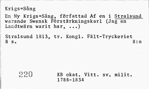 //// Krigs=Sång //// En Ny Krigs=Sång, författad Af en i Stralsund warande Swensk Förstärkningskarl (Jag en Landtwärn warit har, ...) //// Stralsund 1813, tr. Kongl. Fält-Tryckeriet 8 s. 8:0 //// 231 KB okat. Vitt. sv. milit. //// 1788-1834 ////