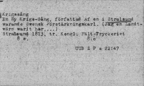//// [Krigssång //// 'En % Krigs-Sång, författad Af en i Stralsynd warande Swensk *orstärkningskarl. (J^TerT Eandt -wärn warit har,...) //// Stralsund 1.81}, tr. Kongl. Fält-tryckeriet 8 s. . 8.o //// UUE 2 P a 2214? ////