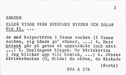//// 2 //// SÅNGER //// ELLER VISOR FRÅN SVERIGES BYGDER OCH DALAR N:o 41. ... //// de med kolportören i Ysane socken (I Ysane socken, sig hände go' vänner, ...) 4. Herr Strank går på gatan så uppsträckt (och nätt ...) 5..Enslingens klagan. Ny kärleksvisa ( Jag blickar upp till himlen, ...) 6. Jösses kärleksönskan (0, Hilda] du sköna, du älskade //// (forts) //// SVA A 2 76 ////