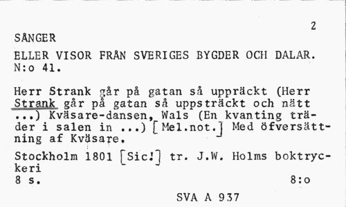 //// 2 //// SÅNGER //// ELLER VISOR FRÅN SVERIGES BYGDER OCH DALAR. N:o 41. //// Herr Strank går på gatan så uppräckt (Herr Strank går på gatan så uppsträckt och nätt ...) Kväsare-dansen, Wals (En kvanting träder i salen in ...) [Mel.not.1 Med öfversätt-ning af Kväsare. //// Stockholm 1801 [Sic.O tr. J.W. Holms boktryckeri //// 8 s. 8:o //// SVA A 9 37 ////