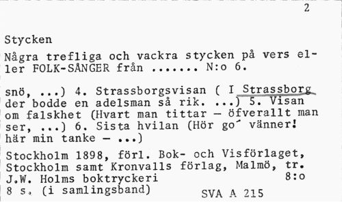 //// 2 //// Stycken //// Några trefliga och vackra stycken på vers eller FOLK-SÅNGER från ... N:o 6. //// snö, ...) 4. Strassborgsvisan ( I Strassborg_ der bodde en adelsman så rik. ...) 5. Visan om falskhet (Hvart man tittar - öfverallt man ser, ...) 6. Sista hvilan (Hör go" vänner! här min tanke — ...) //// Stockholm 1898, förl. Bok- och Visförlaget, Stockholm samt Kronvalls förlag, Malmö, tr. J.W. Holms boktryckeri 8:o //// 8 s, (i samlingsband) SyA & 715 ////