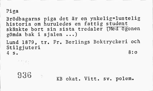 //// Piga //// Brödbagarns piga det är en ynkelig=lustelig historia om huruledes en fattig student skänkte bort sin sista tredaler ITTed Ögonen gömda bak i själen ...) //// Lund 1879, tr. Fr. Berlings Boktryckeri och Stilgjuteri //// 4 s. 8:0 //// q '3 a //// KB okat. Vitt. sv. polem. ////