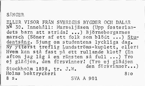//// SÅNGER //// ELLSR VISOR FRÅN SVERIGES BYGDER OCH DALAR N- 30. Innehåll: Marseljäsen (Upp fosterlandets barn att strida! ...) Björneborgarnes marsch (Söner af ett folk som blödt ...) Studentsång. Sjung om studentens lyckliga dag. Ny ytterst treflig Lundströms-kuplett, eller: Hvem kan stå fast på ett rullande klot? (En afton jag låg i en rånsten så full ...) Tro ej glädjen, den försvinner! (Tro ej glädjen //// iono ^ r *tr den försvinner...) //// Stockholm 189 8, tr. J.tf. //// Holms boktryckeri 8:0 //// 8 s. SVA A 901 ////