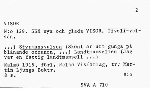 //// 2 //// VISOR //// N:o 129. SEX nya och glada VISOR. Tivoli-val-sen. //// ...) Styrmansvalsen (Skönt är att gunga på blånande oceanen, ...) Landtmamsellen (Jag var en fattig landtmamsell ...) //// Malmö 1915, förl. Malmö Visförlag, tr. Martin Ljungs Boktr. //// 8 s. 8:o ___SVA A 710 ////