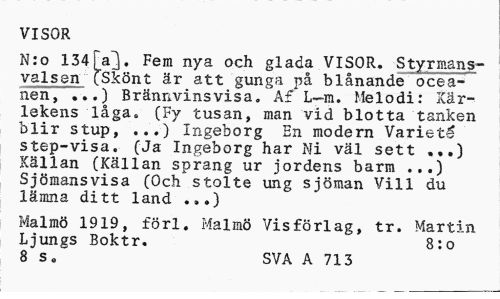 //// VISOR //// N:o 134 W. Fem nya och glada VISOR. Styrmansvalsen CSkönt är att gunga på blånande oceanen, ...) Brännvinsvisa. A£ L~~m. Melodi: Kärlekens låga. (Fy tusan, man vid blotta tanken blir stup, ...) Ingeborg En modern Varieté step-visa. (Ja Ingeborg har Ni väl sett .,.) Källan (Källan sprang ur jordens barm ...) Sjömansvisa (Och" stolte ung sjöman Vill du lämna ditt land ...) //// Malmö 1919, förl. Malmö Vis förlag, tr. Martin Ljungs Boktr. 8:0 //// 8 s« SVA A 713 ////