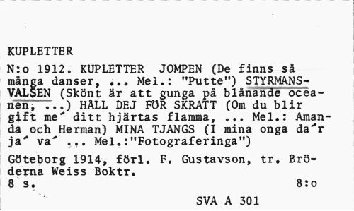 //// KUPLETTER //// N:o 1912. KUPLETTER JOMPEN (De finns så många danser, ... Mel.: "Putte") STYRMANSVALSEN (Skönt är att gunga på blånande oceanen, ...) HÄLL DEJ FÖR SKRATT (Om du blir gift me" ditt hjärtas flamma, ... Mel.: Amanda och Herman) MINA TJANGS (I mina onga da^r ja"* va" ... Mel.:"Fotograferinga") //// Göteborg 1914, förl. F. Gustavson, tr. Bröderna Weiss Boktr. //// 8 s. 8:o //// SVA A 301 ////