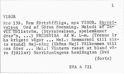 //// 1 //// VISOR //// N:o 139. Fem förträffliga, nya VISOR. Styrsö-valsen Ord af Göran Svenning. Melodi äf Öa-vid Hellström. (Styrsövalsen, spelemänner drar'n, ...) FREDSVISA Af W. L-m. (Trenne år ha krigets vågor Mel.: Sommarsol till sista stund) Maj-sång (Sköna Maj I Välkommen till oss åter ... Mel.: Vintern rasat ut bland våra fjällar) Norrlänningens hemlängtan (Hvi //// (forts) //// SVA A 7 21 ////