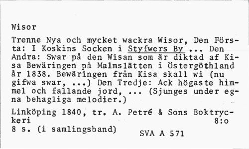 //// Wisor //// Trenne Nya och mycket wackra Wisor, Den Första: I Koskins Socken i Styfwers By ... Den Andra: Swar på den Wisan som är diktad af Kisa Bewäringen på Malmslätten i östergöthland år 1838. Bewäringen från Kisa skall wi (nu gifwa swar, ...) Den Tredje: Ack högaste himmel och fallande jord, ... (Sjunges under egna behagliga melodier.) //// Linköping 1840, tr. A. Petré & Sons Boktryckeri 8:0 8 s. (i samlingsband) gVA A 571 ////
