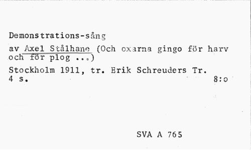 //// Demons trations-sån 5 //// av Axel Stålhane (Och oxarna gingo för harv och för plog .,o) //// Stockholm 1911, tr. Erik Schreuders Tr. 4 s. 8:o //// SVA A 76 5 ////