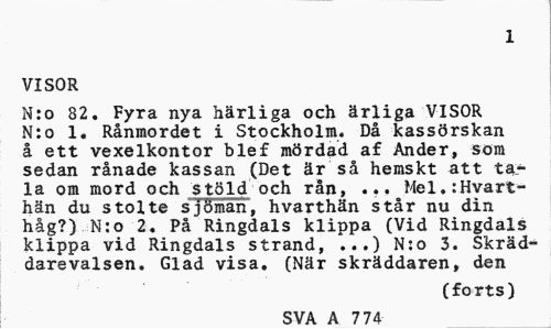 //// 1 //// VISOR //// N:o 82. Fyra nya härliga och ärliga VISOR N:o 1. Rånmordet i Stockholm. Då kassörskan å ett vexelkontor blef mördad af Änder, som sedan rånade kassan (Det är så hemskt att tala om mord och stöld och rån, ... Mel.:Hvart-hän du stolte sjöman, hvarthän står nu din håg?) N:o 2. På Ringdals klippa (Vid Ringdals klippa vid Ringdals strand, ...) N:o 3. Skräddarevalsen. Glad visa. (När skräddaren, den //// (forts) //// SVA A 774 ////