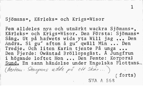 //// 1 //// Sjömans=, Kärleks= och Krigs=Wisor //// Fem alldeles nya och utmärkt wackra Sjömans=, Kärleks= och Krigs=Wisor. Den Första: Sjömans= Sång. Ut på hafwets wida yta Will jag ... Den Andra. Si gu' afton å gu"* qwäll Min Den Tredje. Och liten Karin tjente På unga ... Den Fjerde: Owäntad Bröllopsgäst. Ä Jungfrun i högande löftet Hon ... Den Femte: Xorporal $pnd. En sann händelse under Engelska Flottans.,, //// [åt^hou ¦ Q&Mxntf ncfde fa e/f sJ=Jty ... ^ //// ( forts) //// SVA A. 56 8 ////