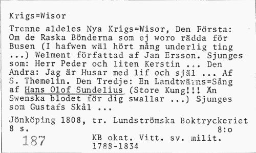 //// Krigs=Wisor //// Trenne aldeles Nya Krigs=Wisor, Den Första: Om de Raska Bönderna som ej woro rädda för Busen (I hafwen wäl hört mång underlig ting ...) Welment författad af Jan Ersson. Sjunges som: Herr Peder och liten Kerstin Den Andra: Jag är Husar med lif och själ ... Af S. Themelin. Den Tredje: En Landtwärns=Sång af Hans Olof Sunde1ius (Store Kung!I! An Swenska blodet för dig swallar ,,„) Sjunges som Gustafs Skål ... //// Jönköping 1808, tr. Lundströmska Boktryckeriet 8 s. 8:o //// 07 KB okat. Vitt. sv. mil it. //// 1 1788-1834 ////