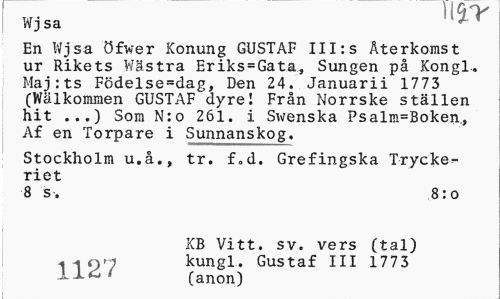 //// Wjsa //// En Wjsa öfwer Konung GUSTAF III:s Återkomst ur Rikets Wästra Eriks = Gata, Sungen på Kongl.. Maj:ts Födelse=dag, Den 24. Januarii 1773 (Wälkommen GUSTAF dyre! Från Norrske ställen hit ...) Som N:o 261. i Swenska Psalm=Boken., Af en Torpare i Sunnanskog. //// Stockholm u.å., tr. f.d. Grefingska Tryckeriet //// 8 s. 8:o //// KB Vitt. sv. vers (tal) ^n-i kungl. Gustaf III 1773 //// (anon) ////