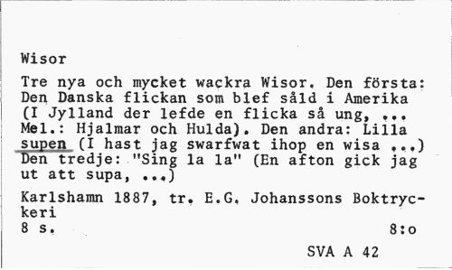 //// Wisor //// Tre nya och mycket wackra Wisor. Den första: Den Danska flickan som blef såld i Amerika (I Jylland der lefde en flicka så ung, ... Mel.: Hjalmar och Hulda). Den andra: Lilla supen (I hast jag swarfwat ihop en wisa »..) Den tredje: "Sing la la" (En afton gick jag ut att supa, ..?) //// Karlshamn 1887, tr, E.G, Johanssons Boktryckeri //// 8 s. 8:0 //// SVA A 42 ////